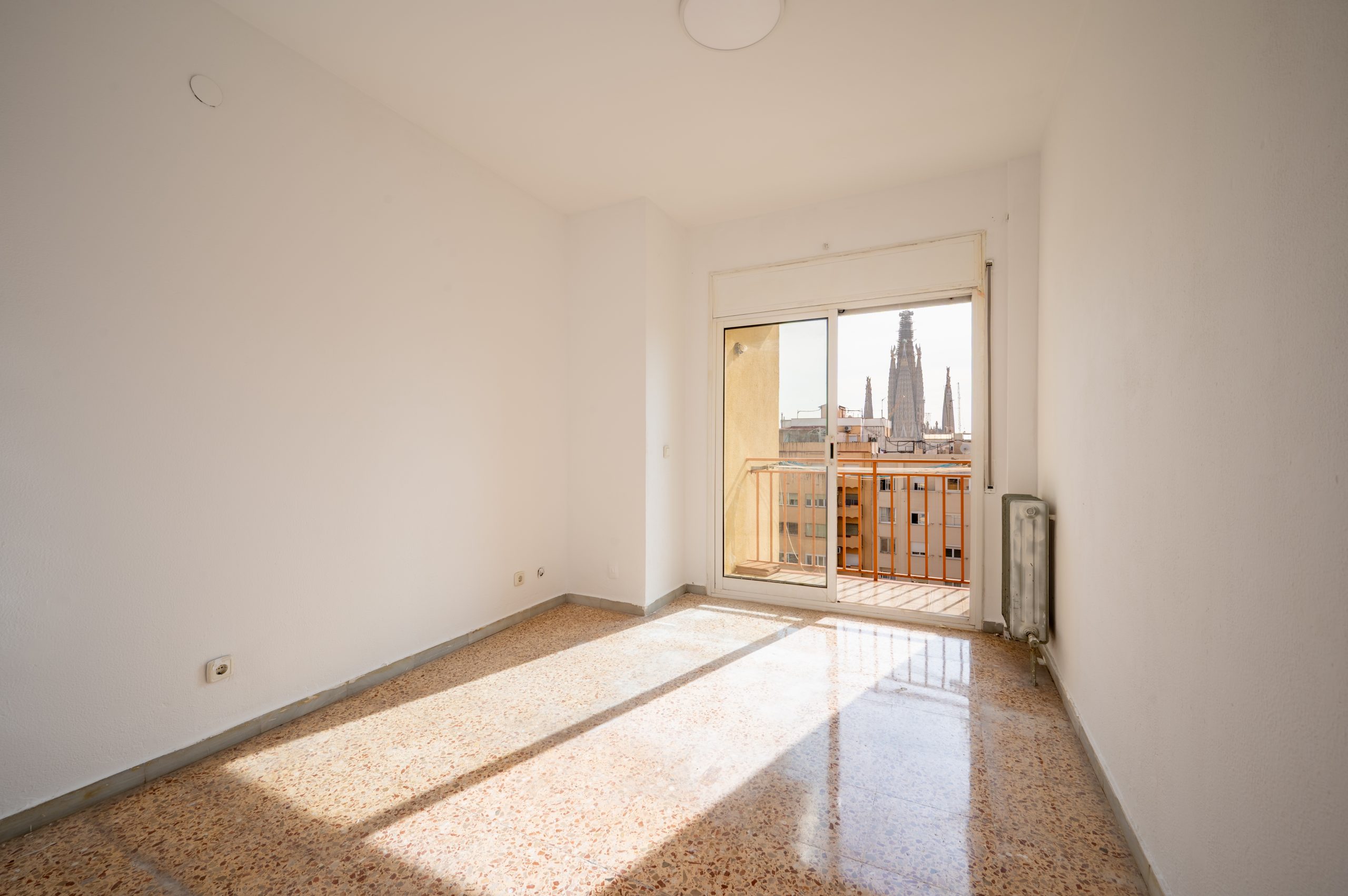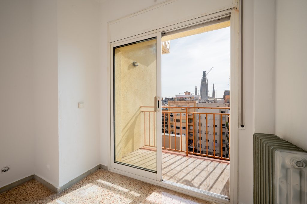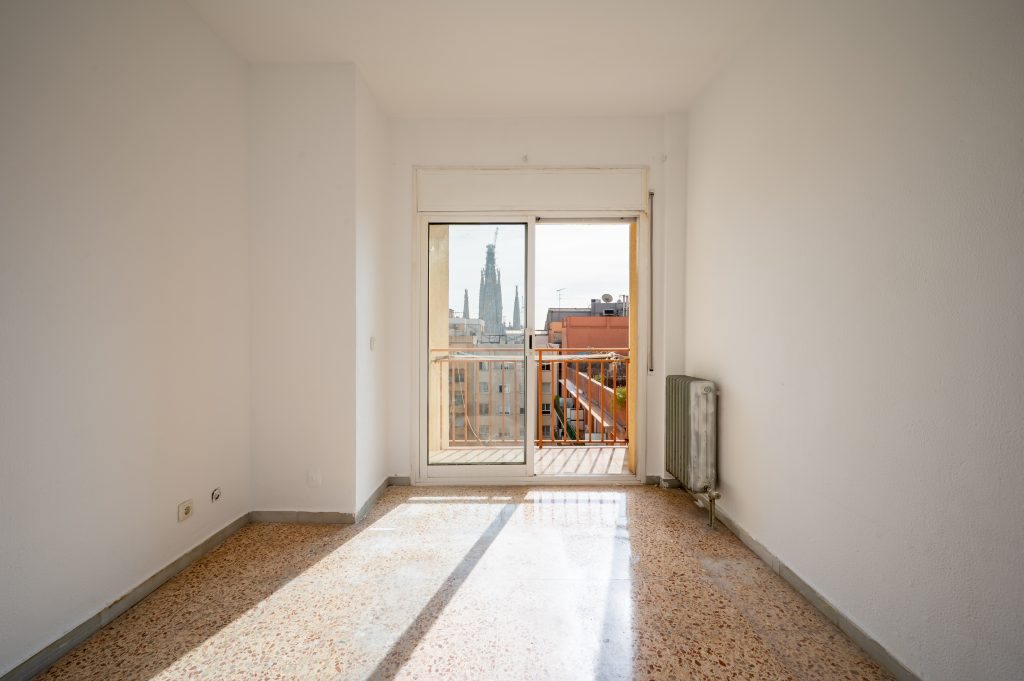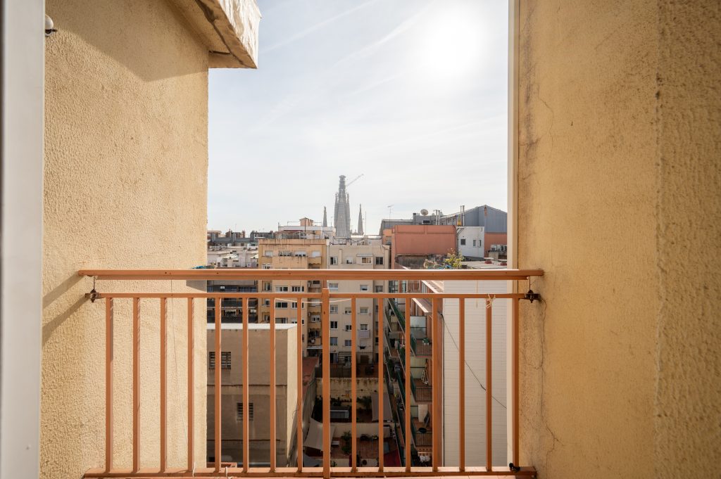 Desde el recibidor, la vivienda nos recibe con una distribución funcional y acogedora. A mano izquierda encontramos la primera habitación, con salida directa al lavadero. A continuación, disponemos de un práctico aseo de cortesía y una cocina independiente, cómoda y funcional, ideal para el día a día. Al final de la planta superior se abre un luminoso salón-comedor con salida a balcón, desde donde podrás disfrutar de unas vistas únicas a la Sagrada Familia, un auténtico privilegio.